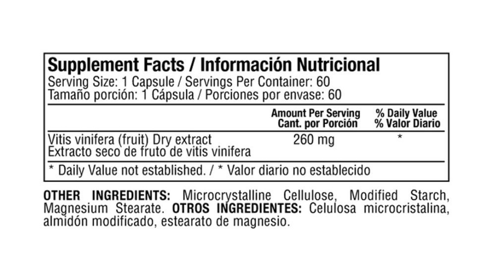 Reswine Resveratrol 260 mg de Healthy America es un suplemento dietario elaborado a partir del extracto seco de Vitis vinifera, la vid de uva. Este compuesto se obtiene de la piel y las semillas de la uva, fuente natural de resveratrol, un potente polifenol con múltiples beneficios antioxidantes y protectores frente al envejecimiento y enfermedades crónicas.