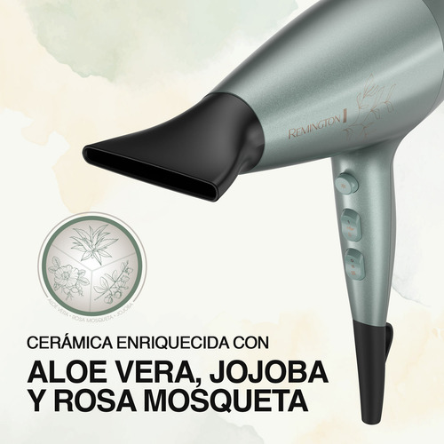 Secador AC Remington Botanicals, D27A-100F. Potencia de 1900 W y tecnología cerámica con aloe vera, jojoba y rosa mosqueta para controlar el frizz.